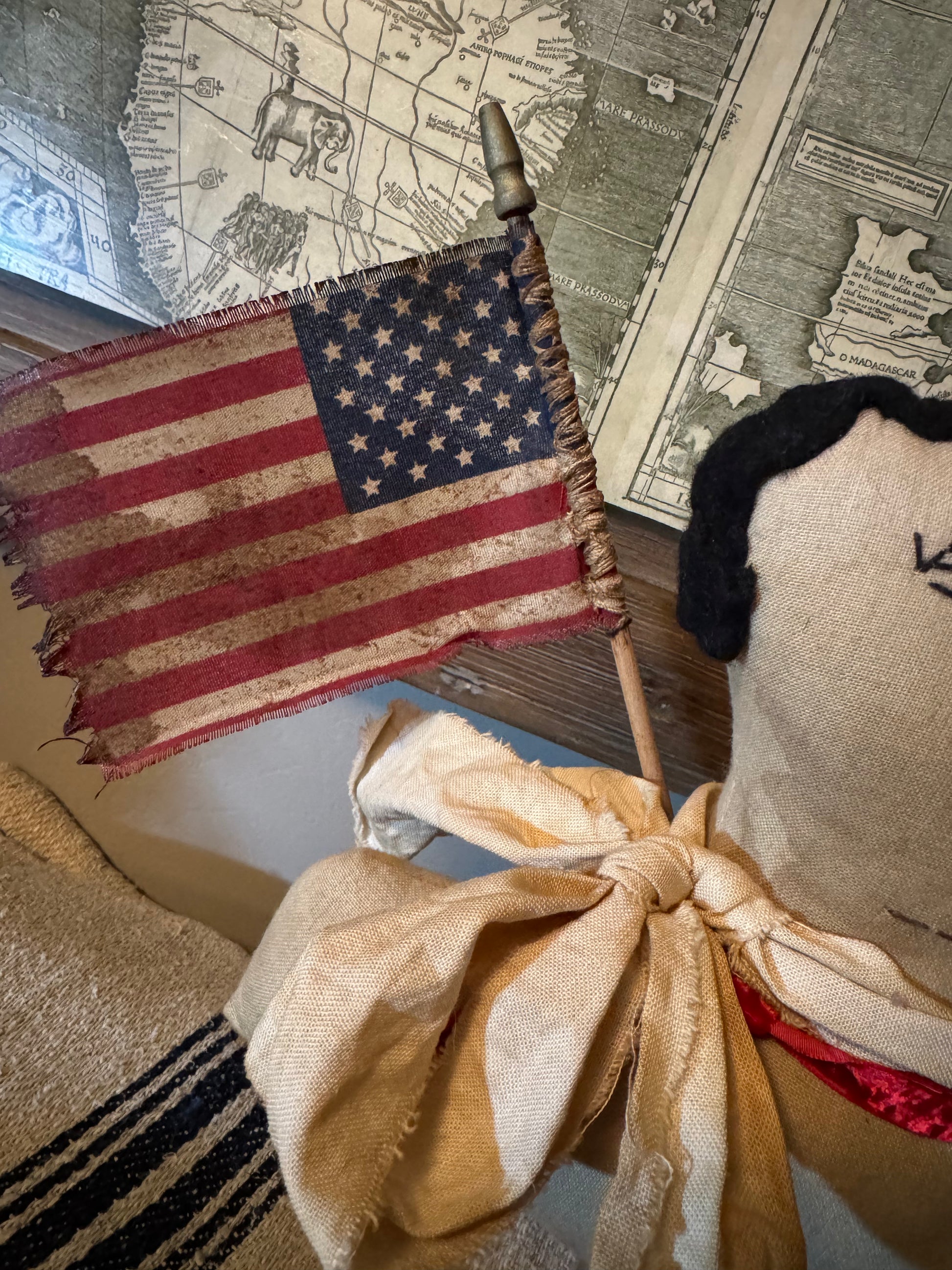 This handcrafted primitive Liberty doll is a charming addition to any farmhouse or cottage decor. Made of aged and stained vintage linen and wool fabric this folk art piece brings a unique and primitive touch to any space. The doll's design and handcrafted nature make it a special piece for collectors or those looking to add a touch of whimsy to their home. She’s distressed and aged perfectly. Hand signed by Six Robins. 16” wide by 12” tall.